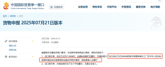 近日,中国国际贸易单一窗口网站发布了货物申报系统新规,针对“EXW”成交方式在出口时填报的要求变了。