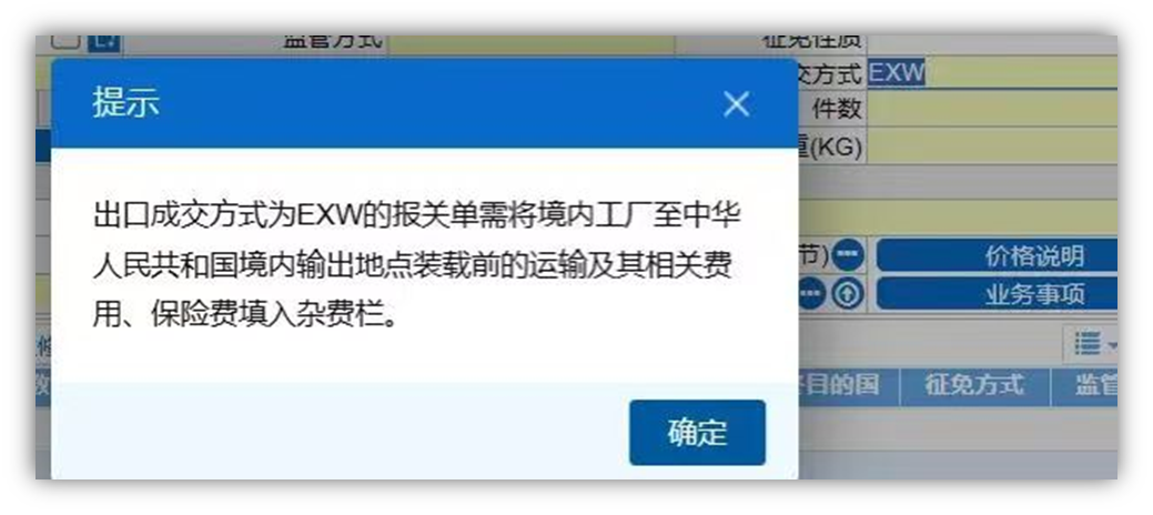 1、出口报关单,成交方式为EXW时,运费和保费栏目置灰,并增加提示“出口成交方式为EXW的报关单需将境内工厂至中华人民共和国境内输出地点装载前的运输及其相关费用、保险费填入杂费栏”。