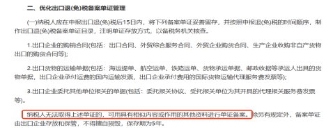 根据2022年9号公告有明确要求,纳税人无法取得上述单证的,可用具有相似内容或作用的其他资料进行单证备案。除另有规定外,备案单证由出口企业存放和保管,不得擅自损毁,保存期为 5 年。
