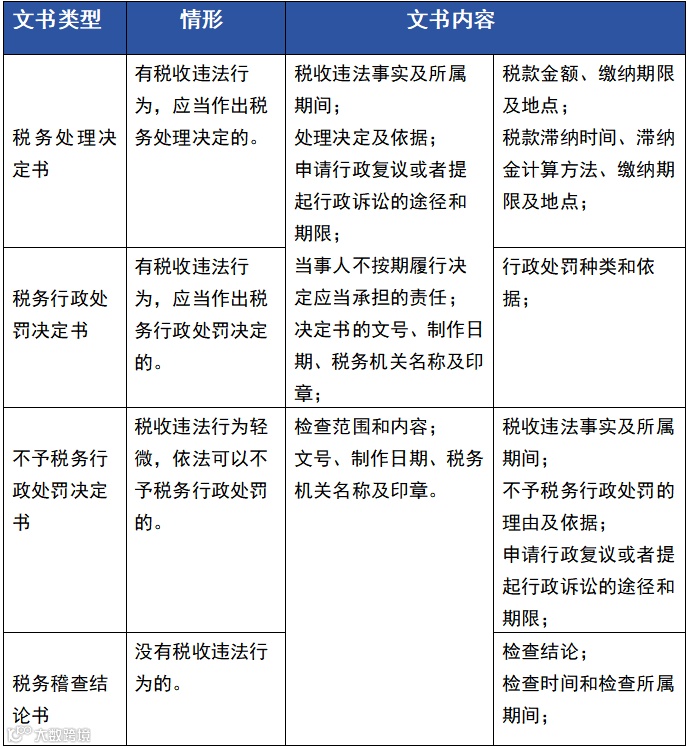 答:税务检查结束后,稽查局会进行审理,区分下列情形分别作出处理。主要有税务处理决定书、税务行政处罚决定书、不予税务行政处罚决定书、税务稽查结论书四种文书。文书内容参考下面图表,希望大家遇到税务稽查收到的都是不予税务行政处罚决定书或者税务稽查结论书。