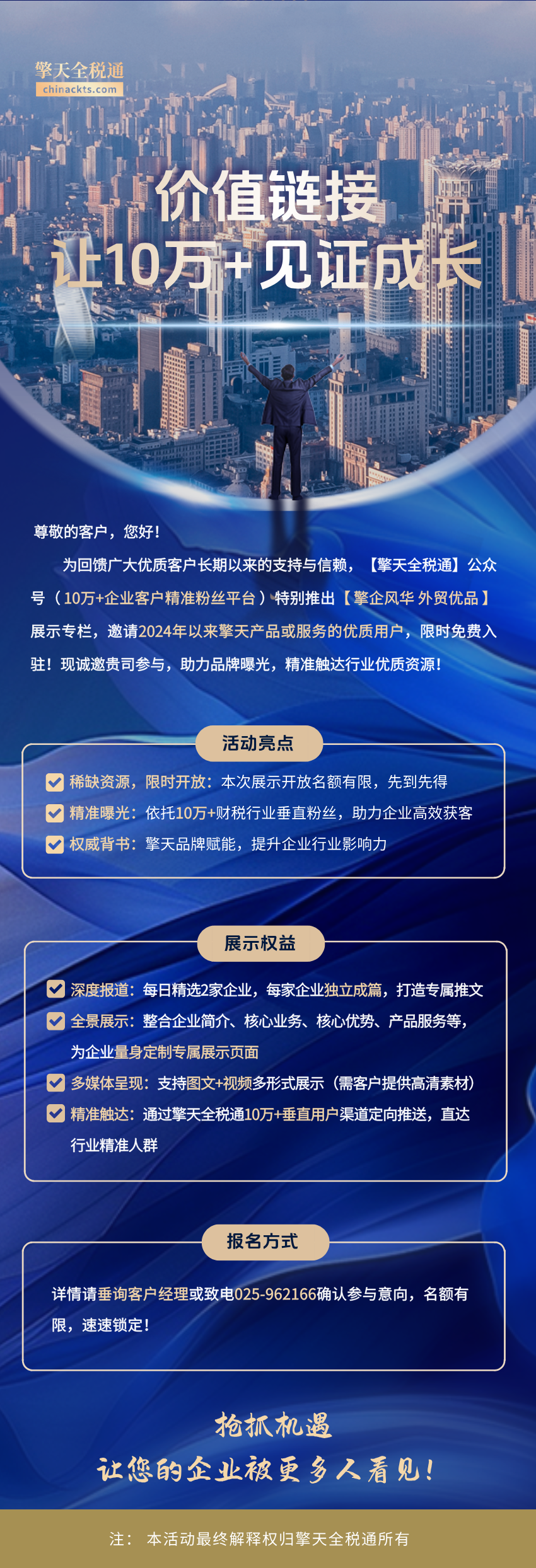 外贸企业还在为品牌曝光发愁?还在苦恼找不到客户?机会来了!擎天全税通重磅推出「擎企风华 外贸优品」展示专栏,限时免费诚邀2024年以来使用过擎天产品或服务的优质用户入驻!