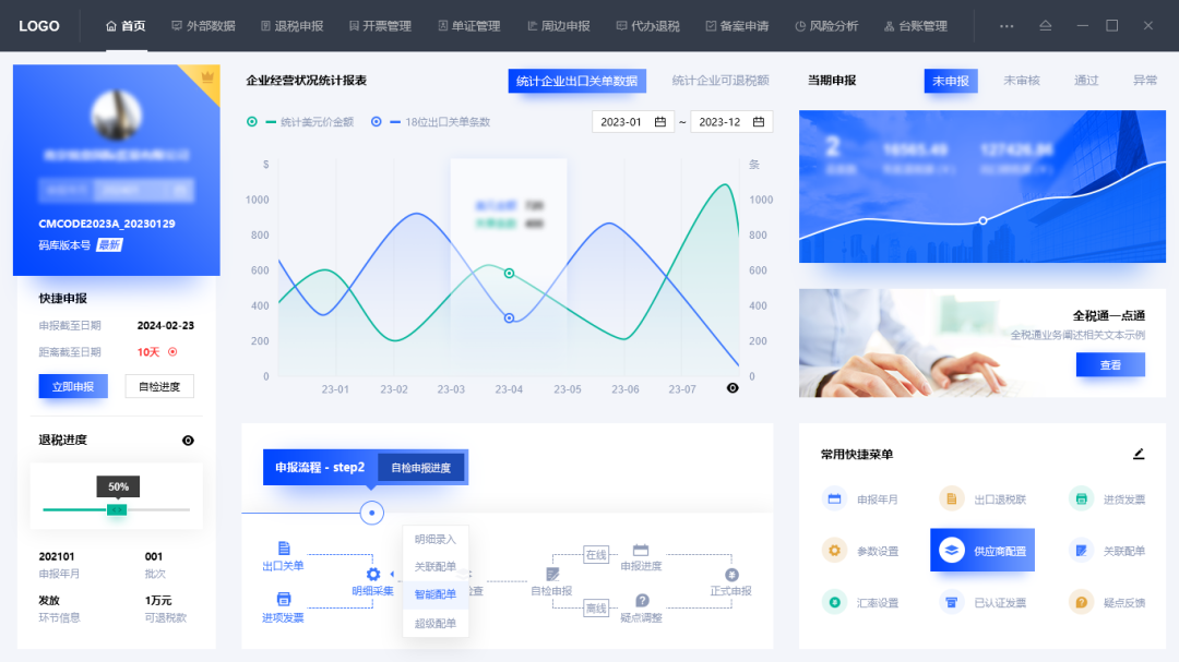 以外贸敏捷云系统为核心,定制自动化出口退税、多币种结算等模块;叠加关贸宝软件实现报关数据与财务系统实时交互,规避风险,实现退税合规管理。采用分阶段部署,2024年完成系统搭建,2025年业务启动即无缝衔接。