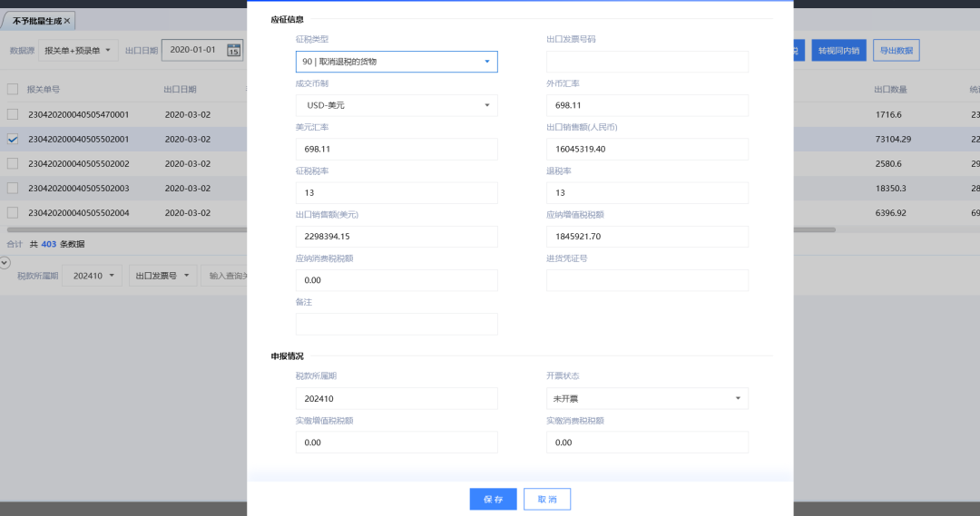 自动清分应征税报关单,根据报关单上商品开票税率,自动赋值征税率开具外销发票,并将开票信息自动回写到应征台账,避免企业开票混乱。