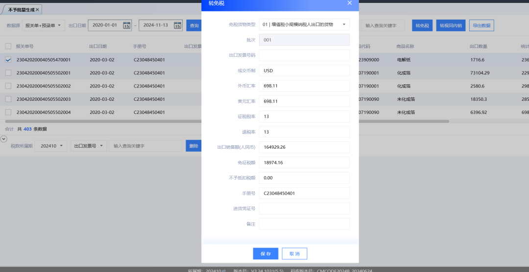 软件关联“应征台账、免税台账、退税数据、出口发票、代理出口证明”等数据,申报时自动判断提示“当期是否申报应征税及不申报理由”。