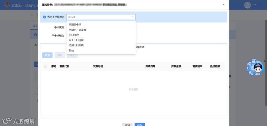 如果报关单里没有当期需要申报纳税的或者不是出口应征税货物货物报关单的,则选在“是否当期申报”栏中勾选“否”,然后选择原因。
