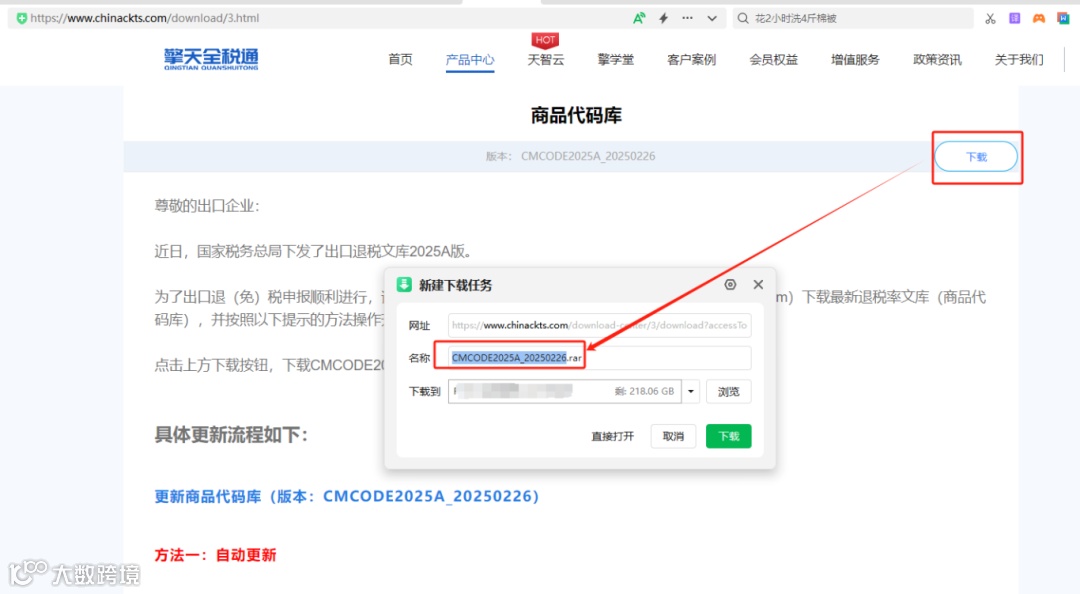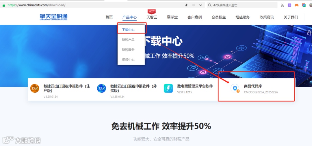 登录出口退税服务平台(www.chinackts.com),点击【产品中心】-【下载中心】-【商品代码库】