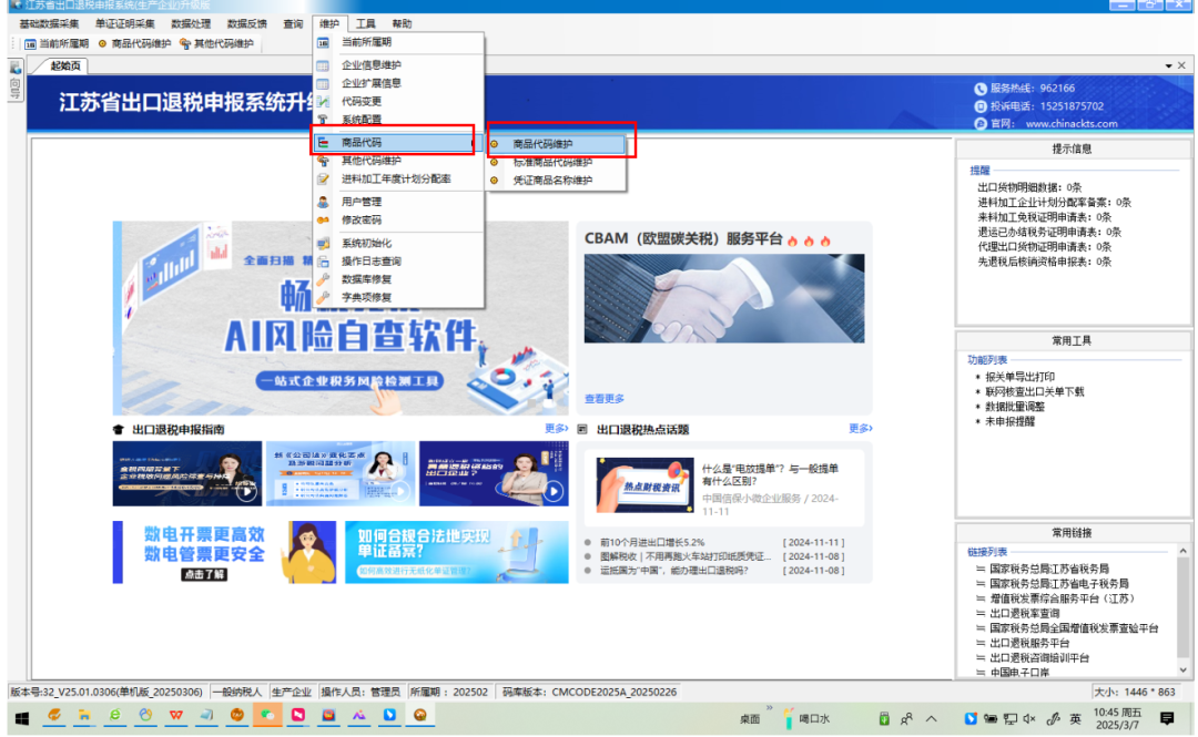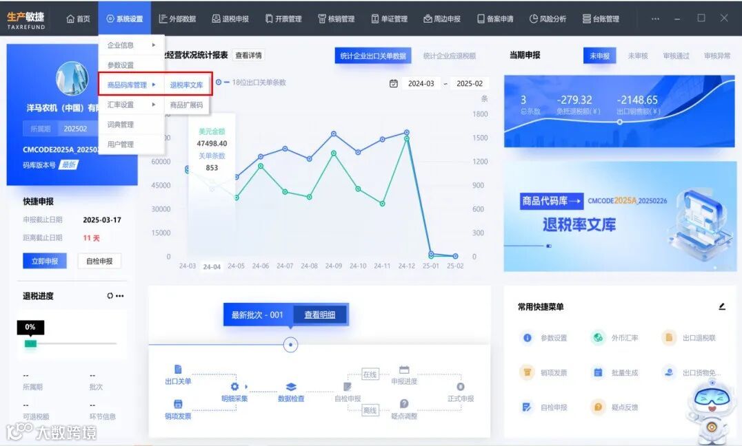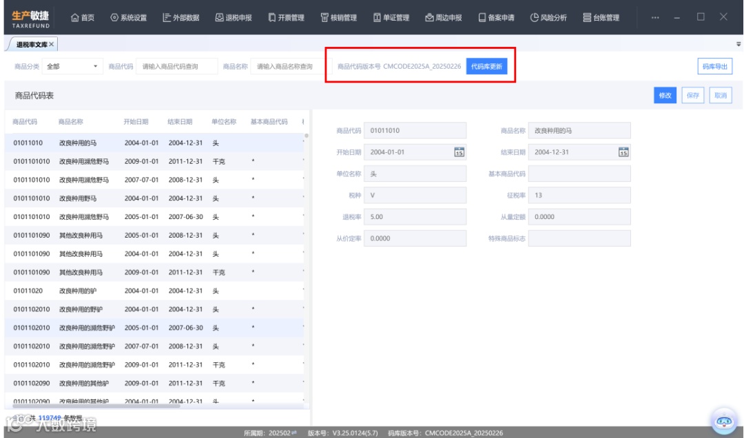 国家税务总局下发了出口退税率文库2025A版。请各出口企业在申报时,务必检查申报系统中的商品代码库是否为最新,如不是2025A版,请进行商品代码库更新。