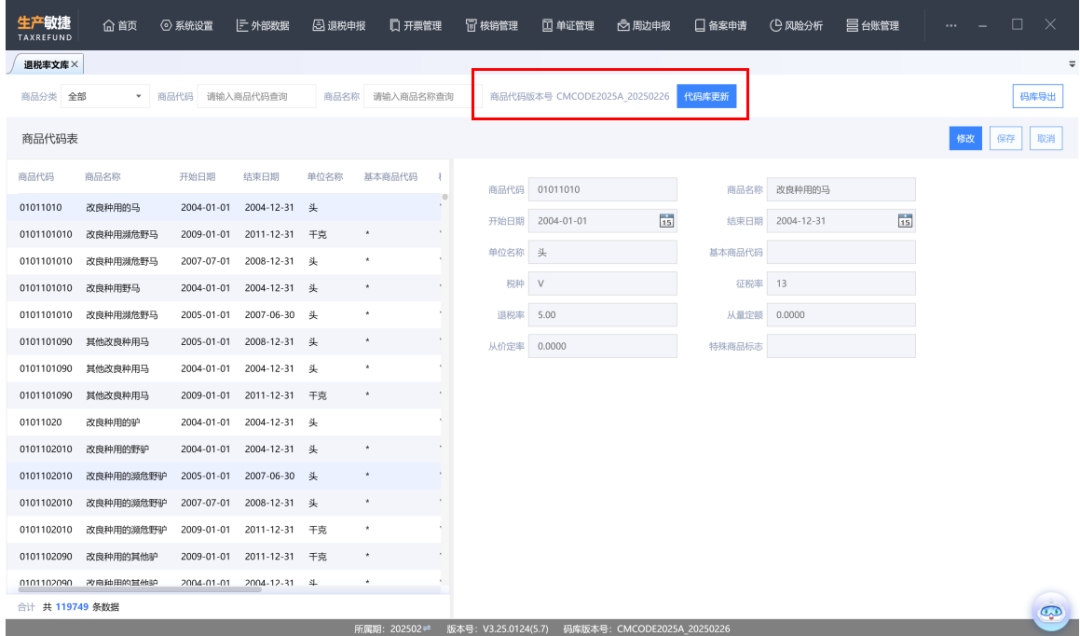 3、更新完成后,点击【确定】,查看系统下方的商品代码库版本是:CMCODE2025A_20250226,表明更新成功。