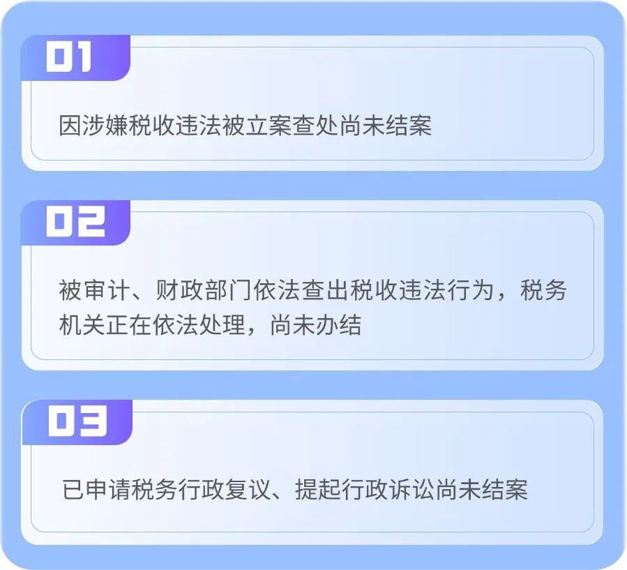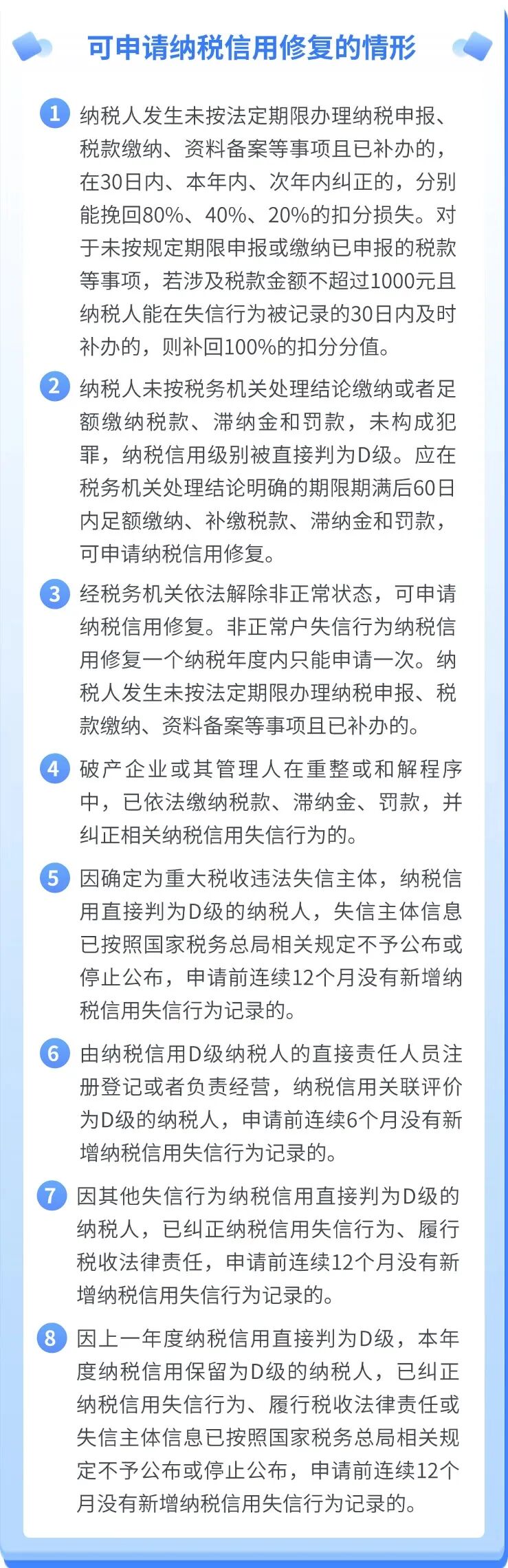 根据《国家税务总局关于纳税信用修复有关事项的公告》(国家税务总局公告2019年第37号),自2020年1月1日起,对纳入纳税信用管理的企业纳税人通过作出信用承诺、纠正失信行为等方式开展纳税信用修复。《国家税务总局关于纳税信用评价与修复有关事项的公告》(国家税务总局公告2021年第31号)出台后,共有以下情形可申请纳税信用修复: