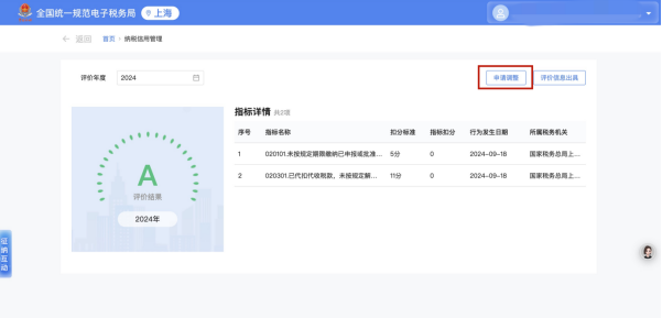 以申请复评为例,在【纳税信用管理】页面,点击右上角【申请调整】,根据弹出的确认框,按自身实际需求选择【申请复评】,点击【确定】。填写表单,确认无误后点击【提交】。