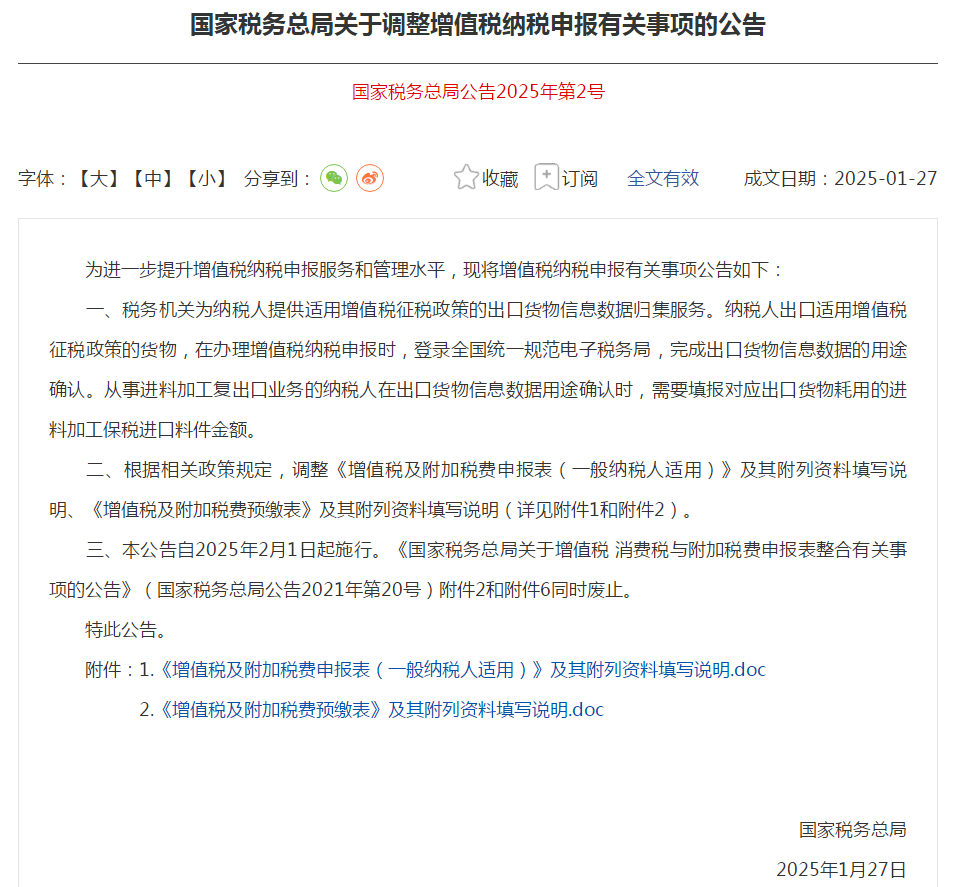 继企业所得税年度纳税申报表修订后,国家税务总局发布关于调整增值税纳税申报有关事项的公告(国家税务总局公告2025年第2号),2025年2月1日起,增值税纳税申报有2点变化: