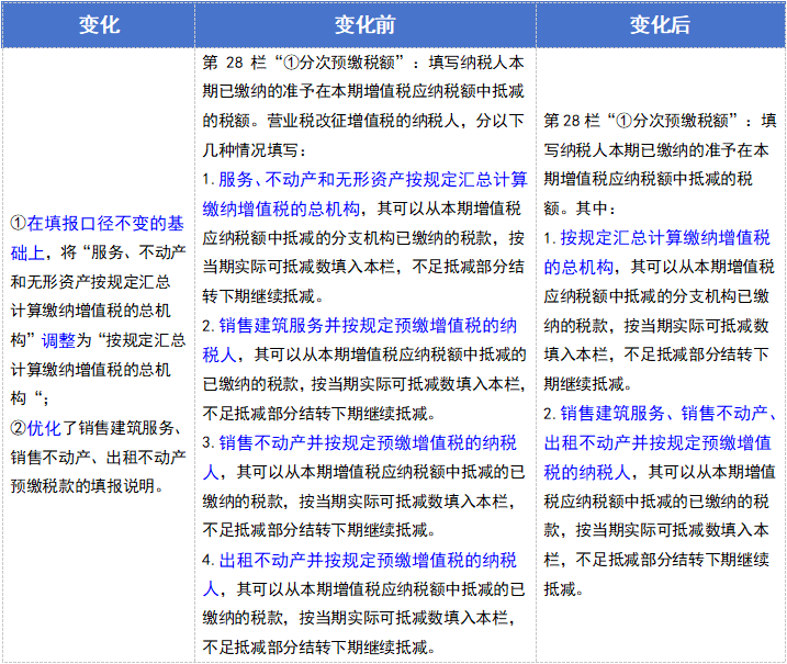 变化2:调整了《增值税及附加税费申报表(一般纳税人适用)》及其附列资料填写说明、《增值税及附加税费预缴表》及其附列资料填写说明。