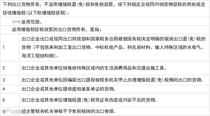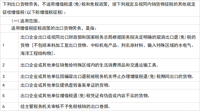 适用增值税征税政策的出口货物(简称出口应征税货物),是指按照现行税收政策规定,在出口环节适用增值税征税政策的货物,包括财政部和国家税务总局根据国务院决定明确取消出口退(免)税的货物,以及按其他规定适用出口征税政策的货物。