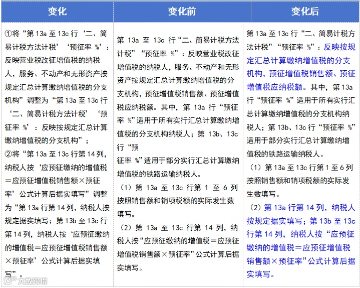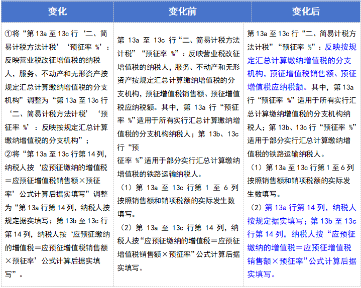 调整了《增值税及附加税费申报表附列资料(一)》(本期销售情况明细)第13a至13c行“预征率 %”栏次的填报口径