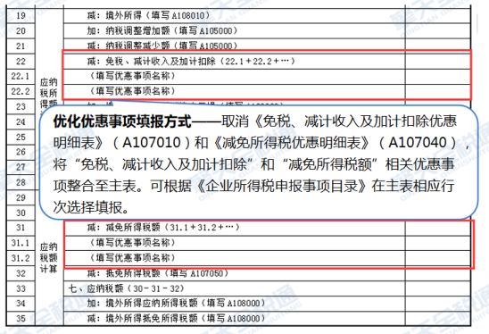 【应对】将“免税、减计收入及加计扣除”和“减免所得税额”相关优惠事项整合至主表,可根据《企业所得税申报事项目录》在主表相应行次选择填报。