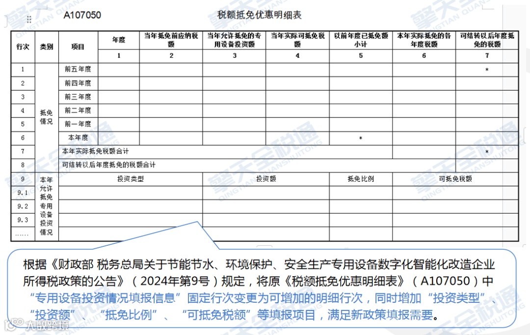 【变化】根据《财政部 税务总局关于节能节水、环境保护、安全生产专用设备数字化智能化改造企业所得税政策的公告》(2024年第9号)规定,将原《税额抵免优惠明细表》(A107050)中“专用设备投资情况填报信息”固定行次变更为可增加的明细行次,同时增加“投资类型”、“投资额”、“抵免比例”、“可抵免税额”等填报项目,满足新政策填报需要。