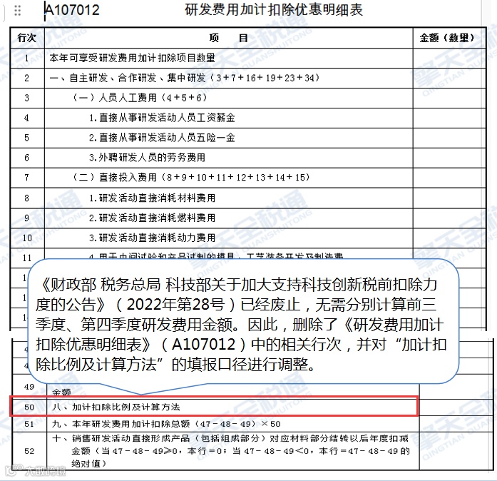 【变化】考虑到《财政部 税务总局 科技部关于加大支持科技创新税前扣除力度的公告》(2022年第28号)已经废止,无需分别计算前三季度、第四季度研发费用金额。因此,删除了《研发费用加计扣除优惠明细表》(A107012)中的相关行次,并对“加计扣除比例及计算方法”的填报口径进行调整。