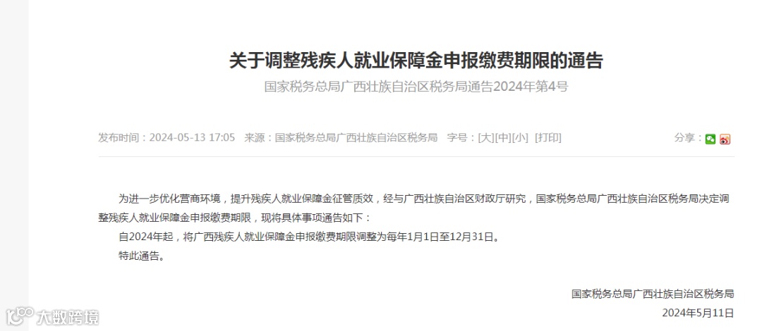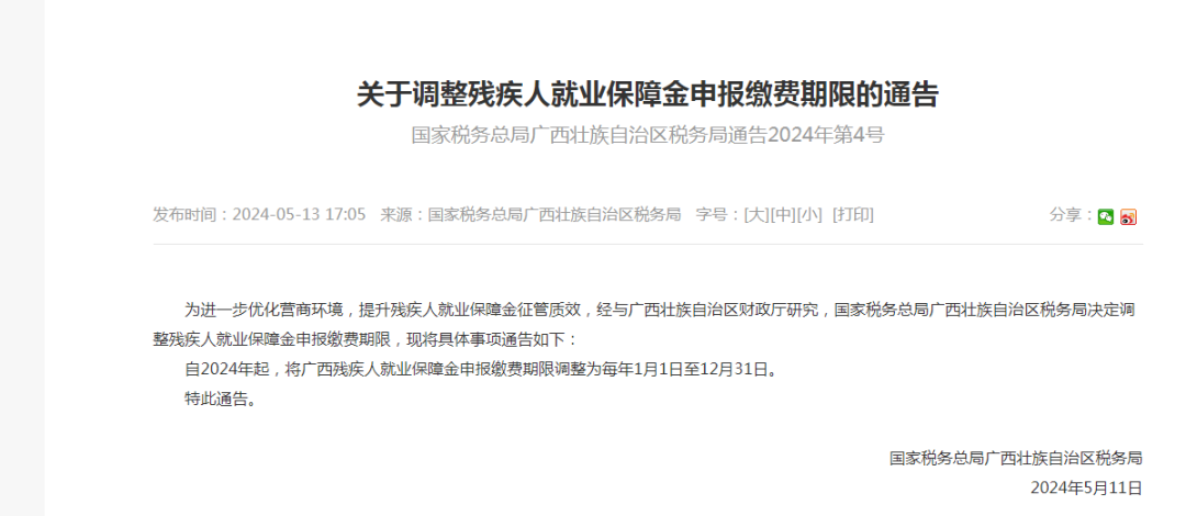广西壮族自治区税务局通告:残疾人就业保障金申报缴费期限调整为每年1月1日至12月31日