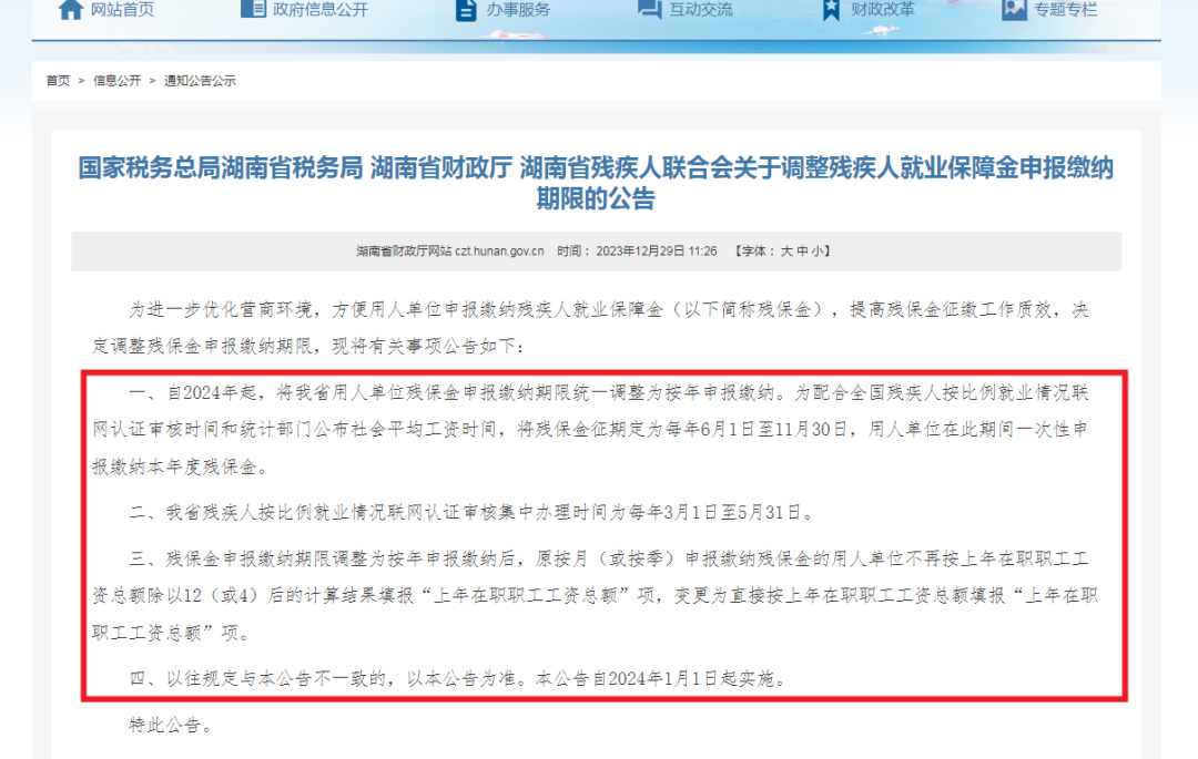 湖南税务局通告:残疾人就业保障金实行按年申报缴纳。