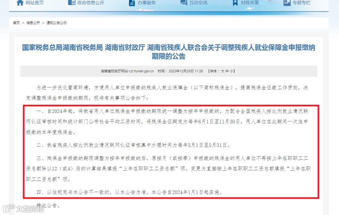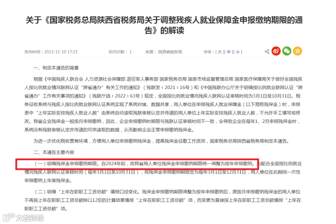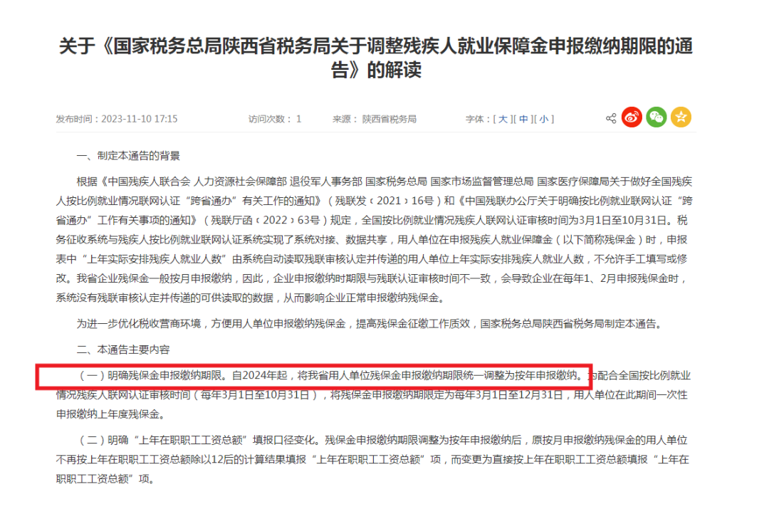 陕西税务局通告:2024年1月1日起,残疾人就业保障金实行按年申报缴纳。