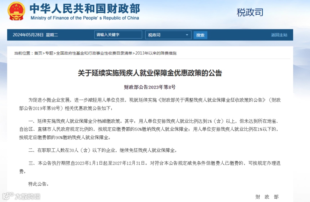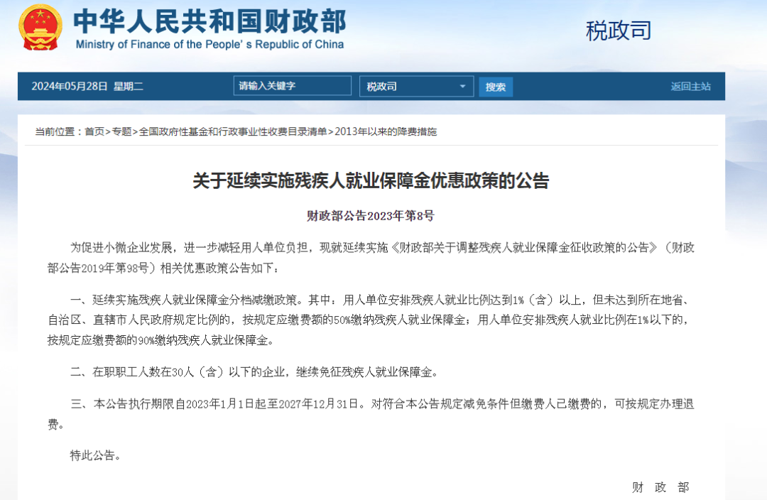 财政部发文,延续实施残疾人就业保障金政策,明确自2023年1月1日—2027年12月31日:对在职职工人数30人(含)以下的企业,暂免征收残保金。