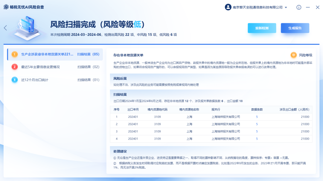 擎天全税通畅税无忧AI风险自查软件系统内置与相关系统高度近似的风险指标、阈值,结合独有的财税数据分析模型和海量风控规则库,综合分析企业出口业务、退税业务、关联交易、进项数据等近百项涉税风险点,智能生成风险检测报告,提前自查潜在风险,正确应对风险。
