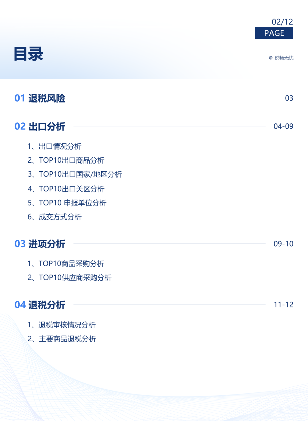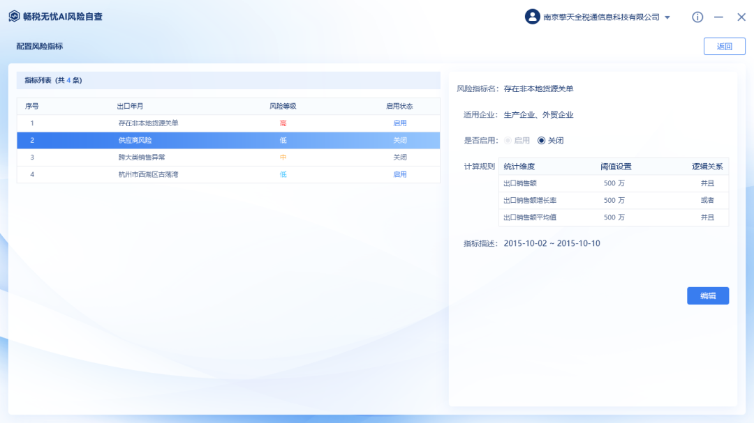 帮助企业自查出口、退税、进项业务等多方面风险,涵盖“未申报类、申报异常、审核异常、视同自产类、应征类、货物流向异常、风险口岸/货物”等生产/外贸企业几十余项指标。