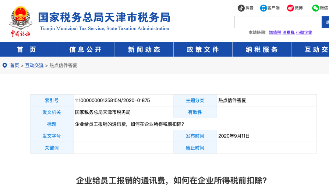 天津税务答复:如果是报销与企业取得收入直接相关的通讯费支出(即因公通讯费,需要证明),可以凭开给个人的发票税前扣除。如果是按职工福利发放,按福利费规定扣除。