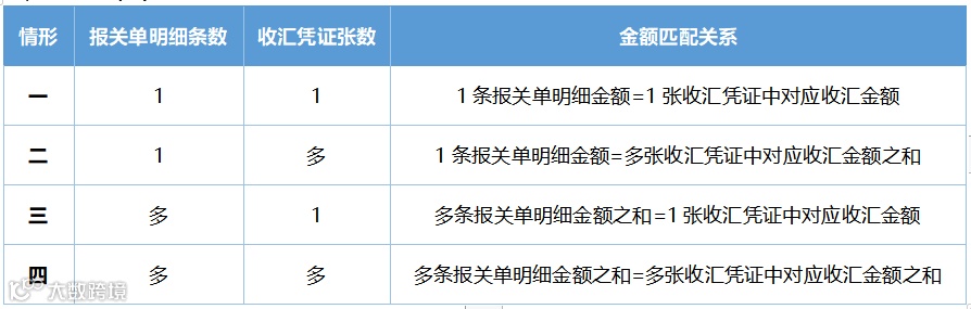 应按照报关单明细金额与收汇凭证金额保持一致的原则进行匹配,可能出现以下情形: