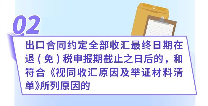 1.因出口合同约定全部收汇最终日期在退(免)税申报期截止之日后的,未在合同约定收汇日期前完成收汇;