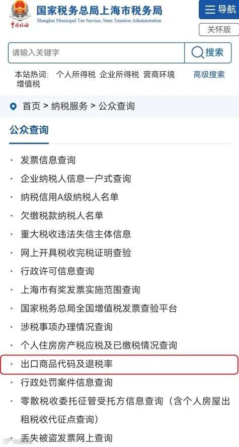 登录税务局官网,点击【我要查询】模块,找到【出口商品代码及退税率】模块。在【商品代码】一栏输入海关商品编码前8位,点击【查询】,即可查看该商品对应的出口退税率及相关信息。
