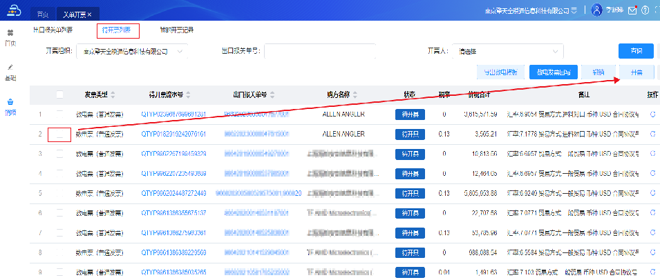 通过“出口报关单列表”页面,提交开票信息后,待开票关单列表中即可显示可开票关单,勾选关单数据点击“发票开具”即可完成开票。