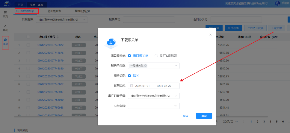 通过“销项→出口报关单列表”页面,选择出口日期时间范围可批量下载出口报关单退税联和预录入单信息。下载报关单数据时仅需插入电子口岸IC卡,无需登录电子口岸。
