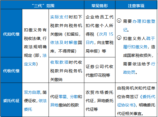 “三代”是指:代扣代缴、代收代缴、委托代征,简称代扣、代收、代征。