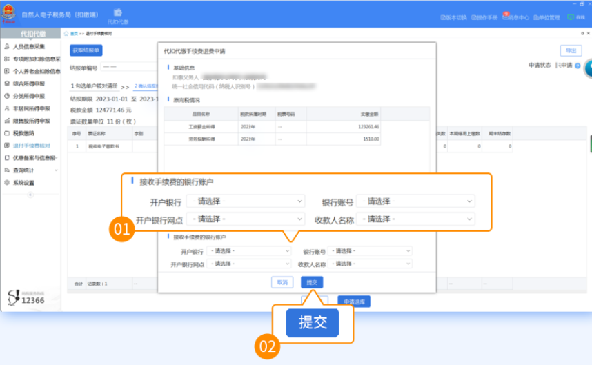 第五步:在“代扣代缴手续费退费申请”界面中依次选择“开户银行”、“银行账号”等信息,点击【提交】即完成申请。
