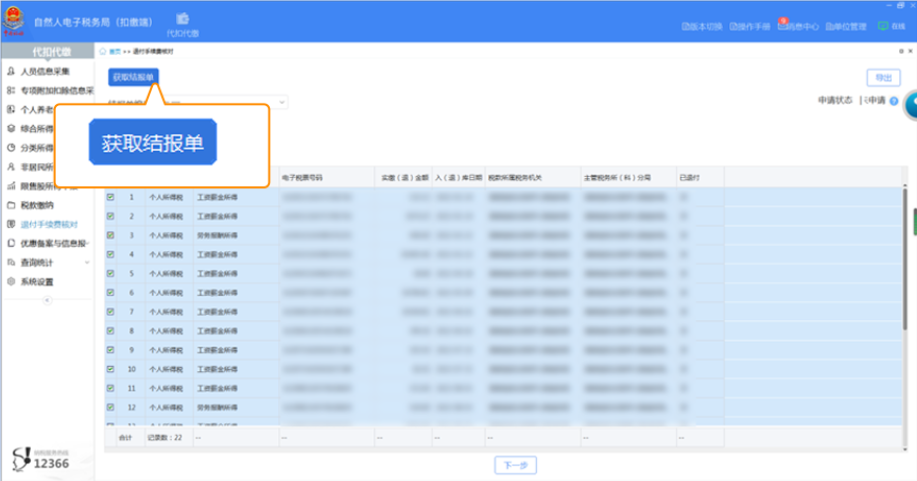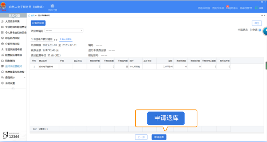 第三步:点击“获取结报单”,核对单位2023年度扣缴税款信息,确认实缴(退)金额以及入(退)库时间是否正确。