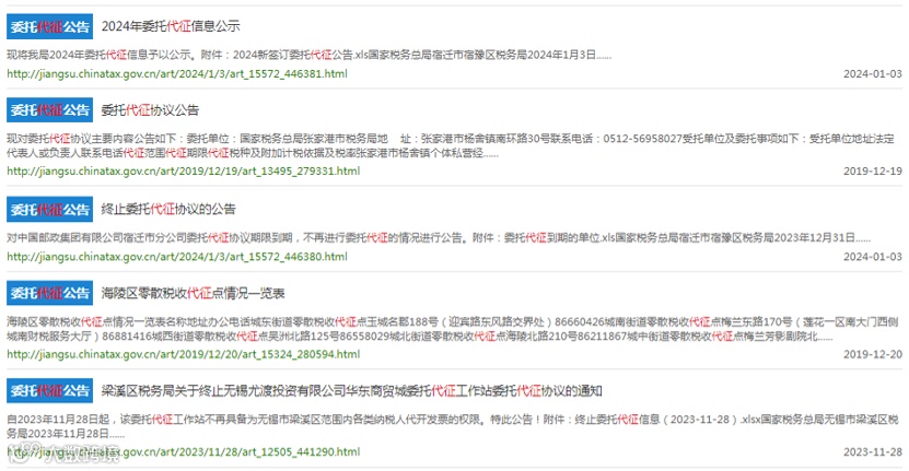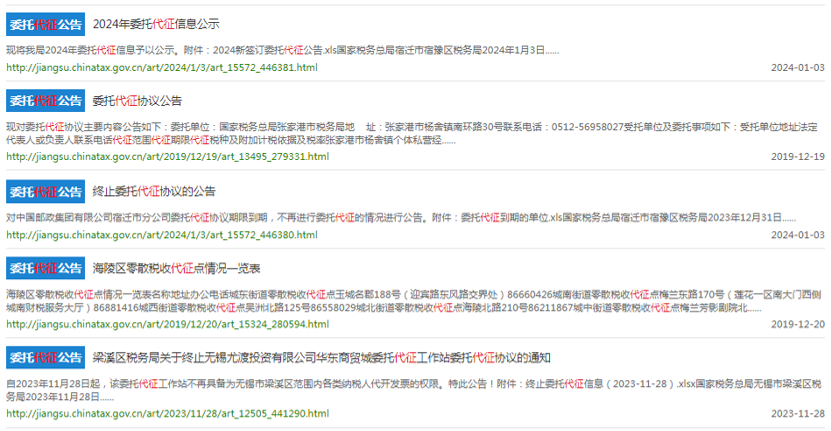 可在各地区税务局网站查看委托代征信息和终止委托代征公告,同样以江苏省税务局为例: