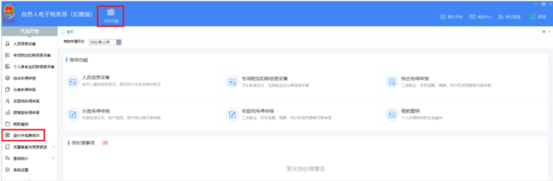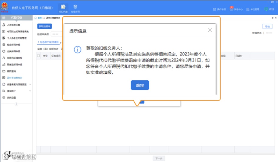 第二步:登录后,在“代扣代缴”界面,点击左侧菜单栏内的“退付手续费核对”,系统自动弹出“确认信息”提示框,点击【确定】,系统自动带出单户核对清册。