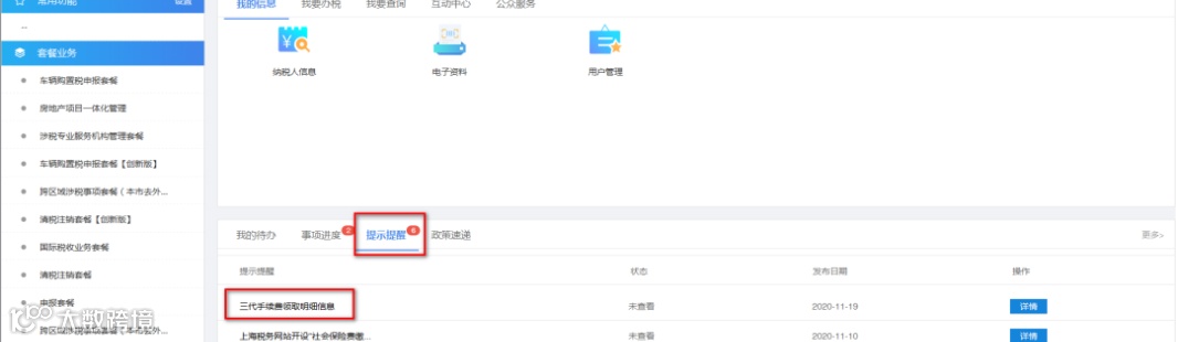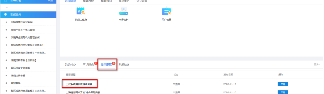 在电子税务局提示提醒中找到三代手续费推送的链接信息。
