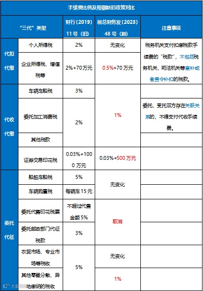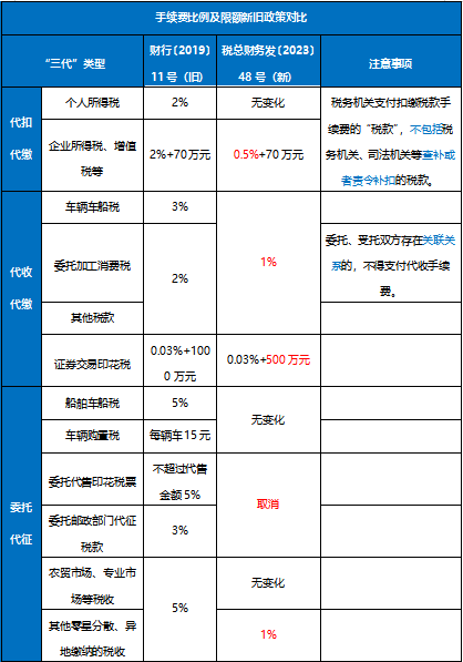 税总财务发〔2023〕48号公告对不同的“三代”行为,规定了不同的手续费计算方法,且与财行〔2019〕11号公告相比,部分“三代”行为的手续费比例和限额有所下降: