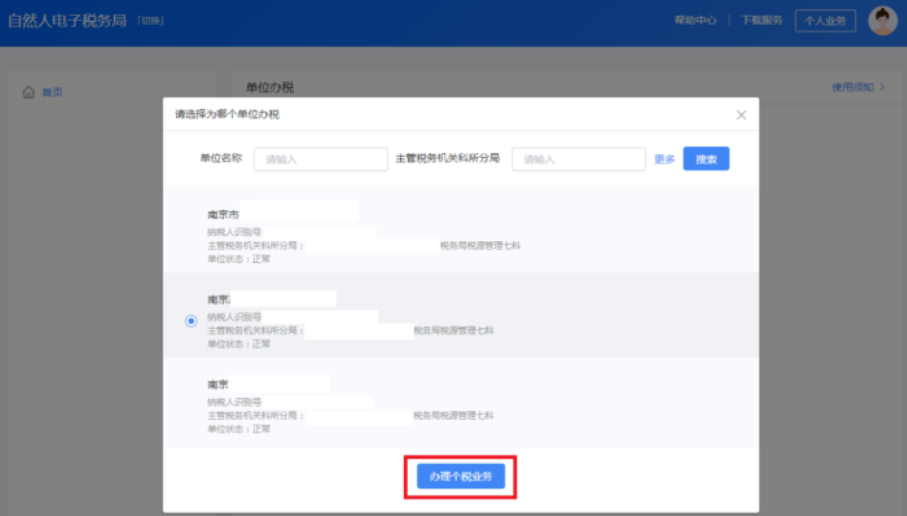 办税人员被授予企业扣缴权限后,登录自然人电子税务局网页端会显示【单位办税】入口,进入单位办税后,选择对应企业,点击【办理个税业务】。