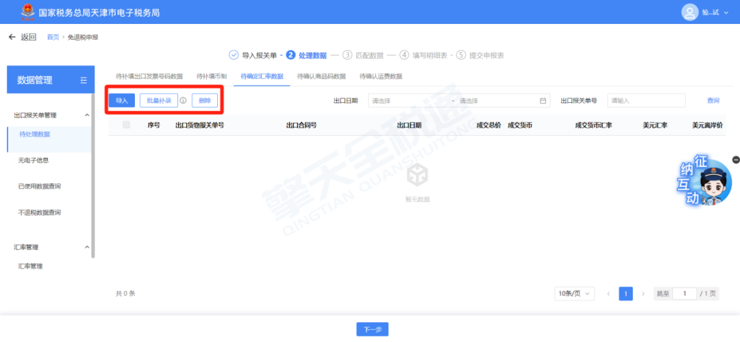 ③待确认汇率数据中点击【导入】按钮可进入导入对话框,将Excel数据批量导入至系统内,进行批量处理;Excel模板可点击“下载模板”获得,点击【批量补录】可将勾选数据批量填写“汇率”;点击【删除】可将勾选数据进行删除,删除时同步将“待补填出口发票号数据”、“待确定汇率数据”“待确认商品码数据”和“待确认运费数据”中当前报关单数据同步删除。