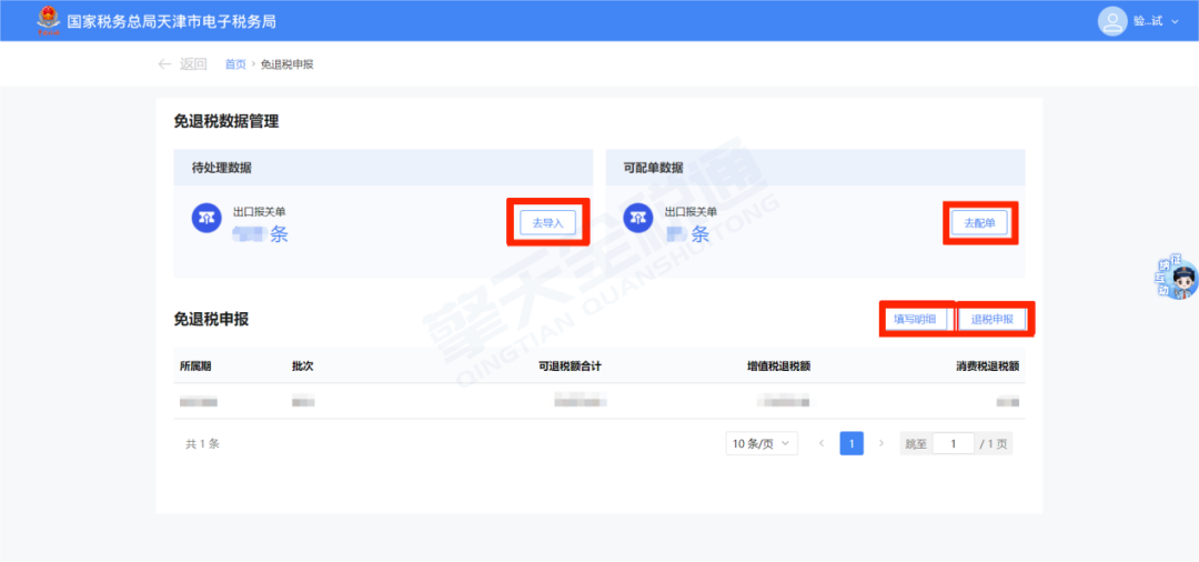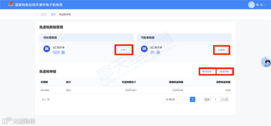 进入系统后,页面上方展示当前系统内待处理报关单条数和可配单报关单条数,界面下方展示所属期、批次、可退税额合计、增值税退税额和消费税退税额。