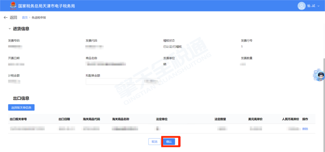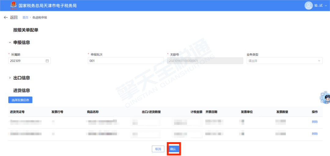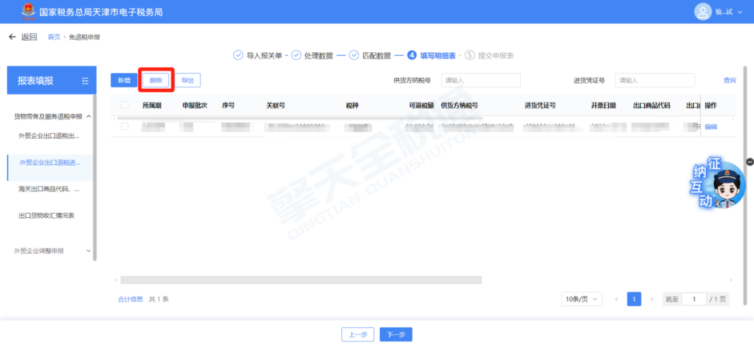 (5)选择发票数据后,可在当前发票数据后方点击【删除】 按钮,删除此行发票数据。