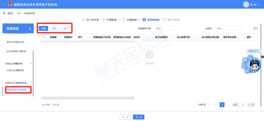 (5)如纳税人需要跨境应税行为申报可选择“外贸企业外购服务免退税申报”,可填写跨境应税行为免退税申报明细表,其中点击【新增】 按钮,可弹出新增窗口进行数据录入操作,勾选数据点击【删除】 按钮,可将勾选数据进行删除,【导出】按钮可将当前筛选条件下的数据导出至Excel。