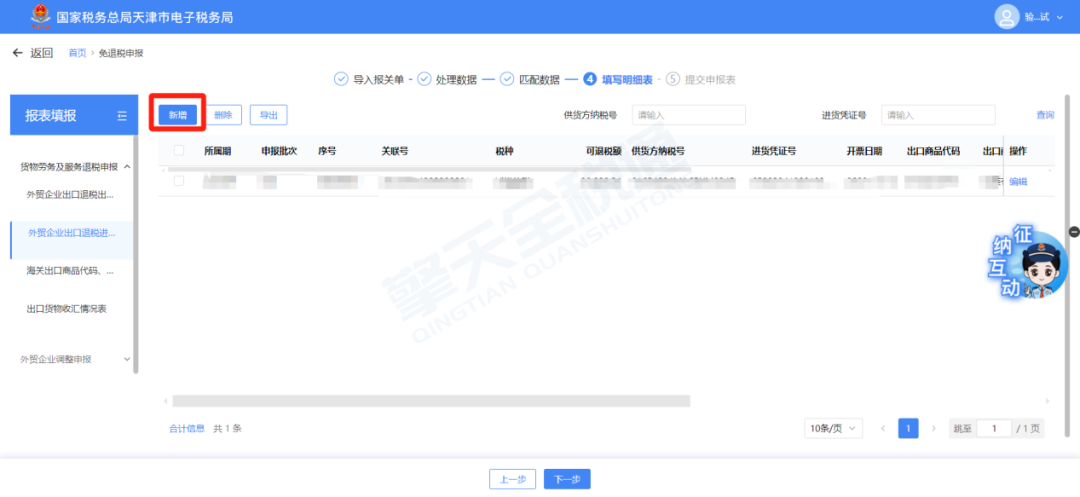 ①在外贸企业出口退税出口明细申报表,点击“新增”按钮,页面将弹出采集框。