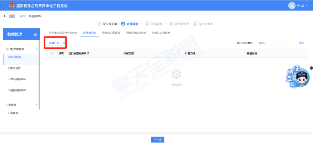 ②待补填币制中点击【批量补录】可将勾选数据批量填写“币制”。