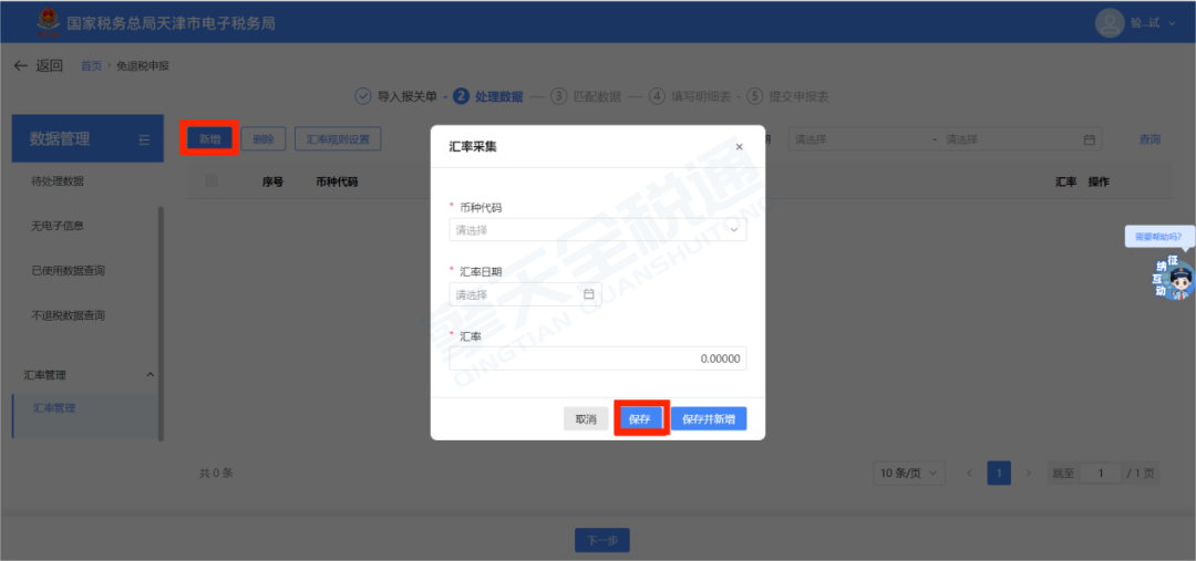 ①在汇率管理页面点击【新增】按钮,页面将弹出汇率采集框,录入需要的“币种代码”,自动带出币种名称,录入“汇率日期”、“汇率”值数据,点击 “保存”或“保存并新增”按钮。
