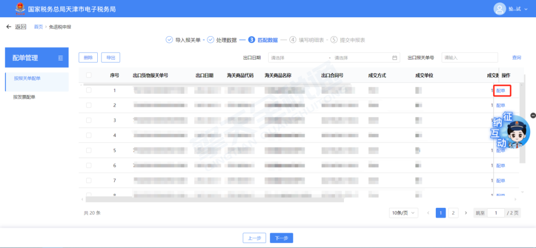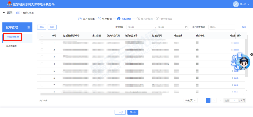 1.进入“匹配数据”界面后选择“按报关单配单”,界面展示已处理过的报关单数据。