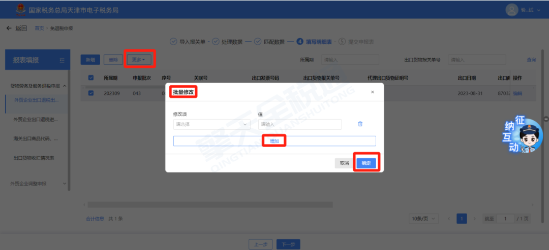 ④勾选数据点击【更多】-【批量修改】按钮,可在批量修改界面中修改“所属期”、“申报批次”、“出口发票号”、“出口日期”、“美元离岸价”、“业务类型代码”、和“备注”,如想修改多个字段,可点击【增加】按钮,新增行,输入修改内容后点击【确定】 按钮即可将数据保存。